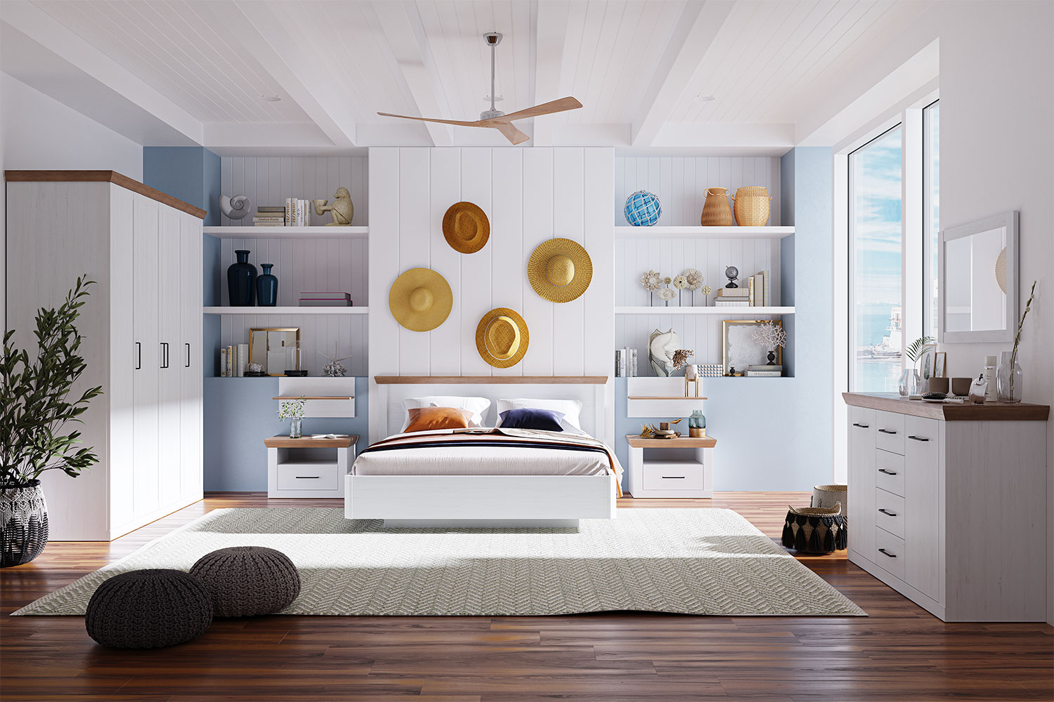 Мебель выполнена в цветах «блан шене» и «дуб бунратти»;